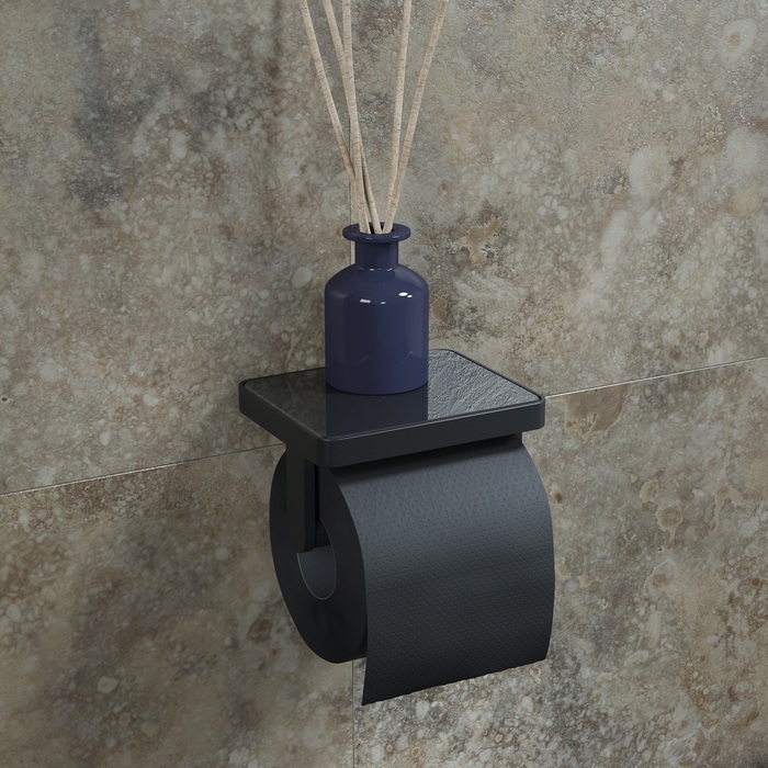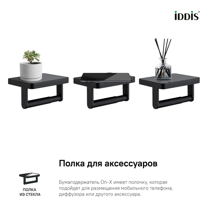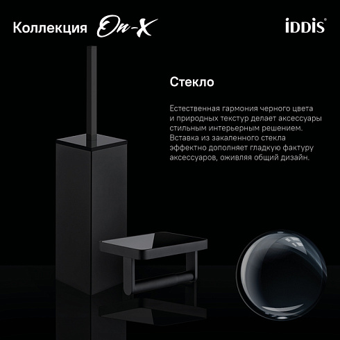 Вдохновленная актуальными трендами из мира дизайна коллекция On-X. Естественная гармония черного цвета и природных текстур делает аксессуары стильным интерьерным решением. Вставка из закаленного стекла эффектно дополняет гладкую фактуру продукта, оживляя общий дизайн. Бумагодержатель On-X имеет полочку, которая подойдет для размещения мобильного телефона или диффузора.