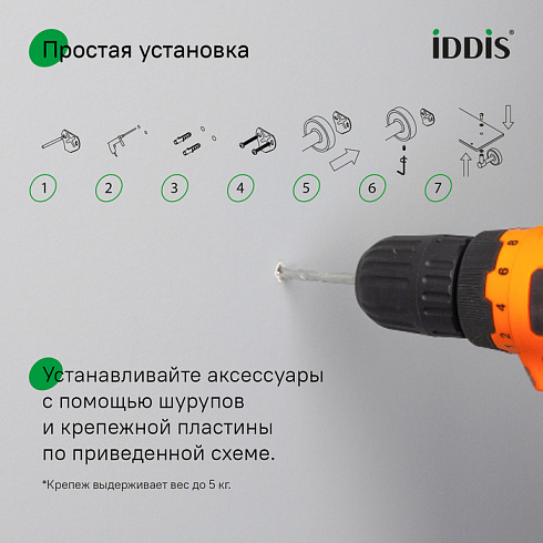 Держатель удобен в установке, монтаж не требует профессиональных навыков. Крепёжные элементы скрыты корпусом, что обеспечивает привлекательный и аккуратный внешний вид. Крепёж выдерживает вес до 5 кг.