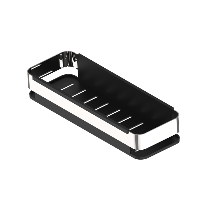 Прямоугольная полка для ванной комнаты размером 300х128 мм вместит все необходимое для комфортного принятия душа. Внутри полки размещен гигиеничный короб – съемная вставка из прочного ABS-пластика в цвет внешнего корпуса, которая легко вытаскивается и моется, не ржавеет и не деформируется, не впитывает запахи. Изделие выполнено в трендовом черном цвете и станет ярким акцентом в любом интерьере.