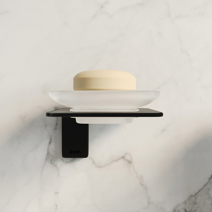 Мыльница Slide из матового белого стекла в держателе черного матового цвета. Благодаря прямым линиям и функциональному дизайну подойдет для интерьера любой современной ванной.