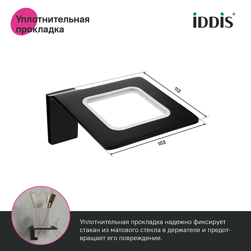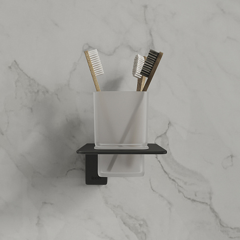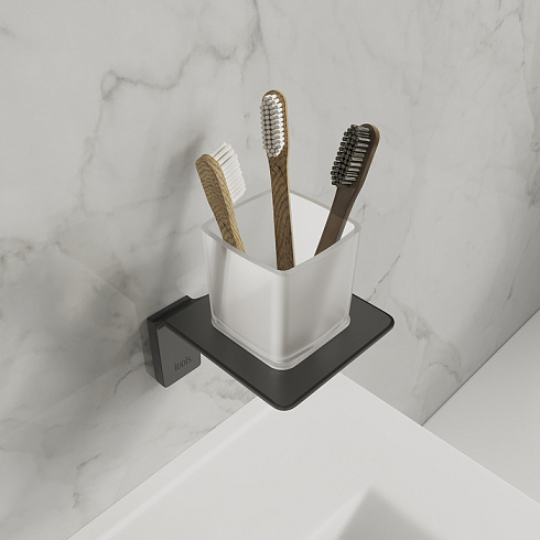 Подстаканник Slide из матового белого стекла в черном матовом держателе благодаря прямым линиям и функциональному дизайну подойдет для интерьера любой современной ванной.
