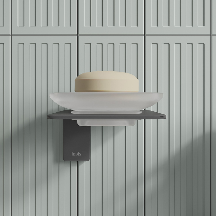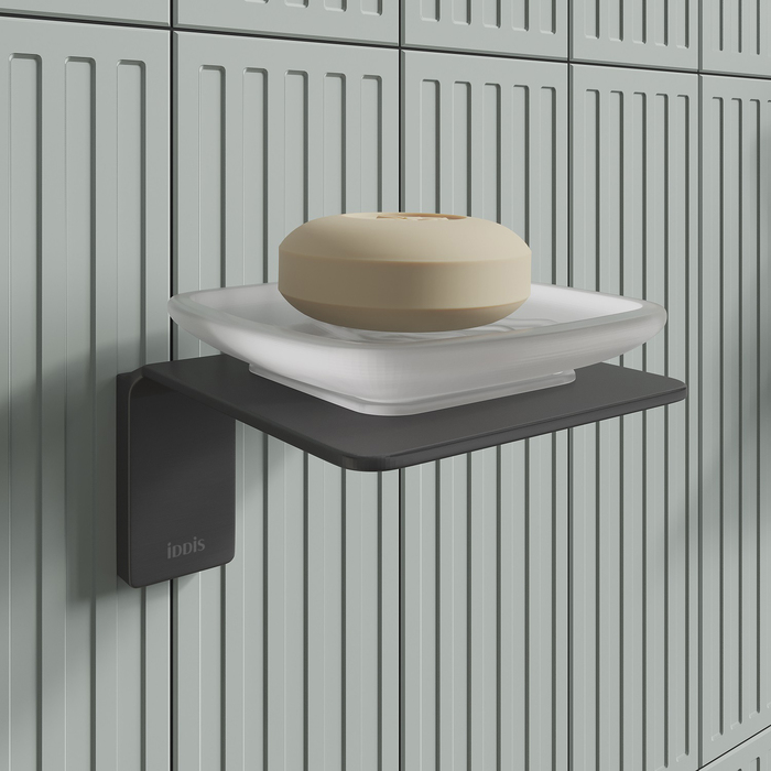Мыльница Slide из матового белого стекла в держателе графитового оттенка. Благодаря прямым линиям и функциональному дизайну подойдет для интерьера любой современной ванной.