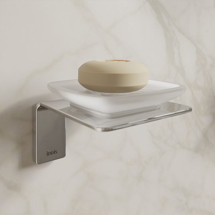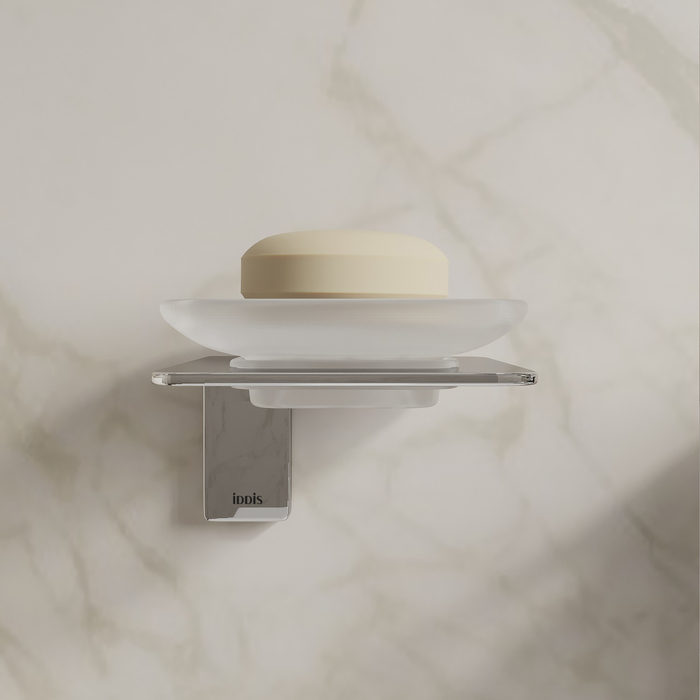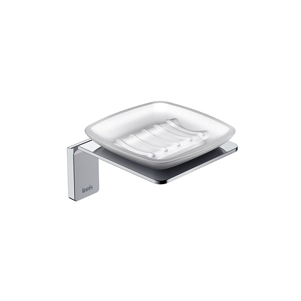 Мыльница Slide из матового белого стекла в хромированном держателе благодаря прямым линиям и функциональному дизайну подойдет для интерьера любой современной ванной.