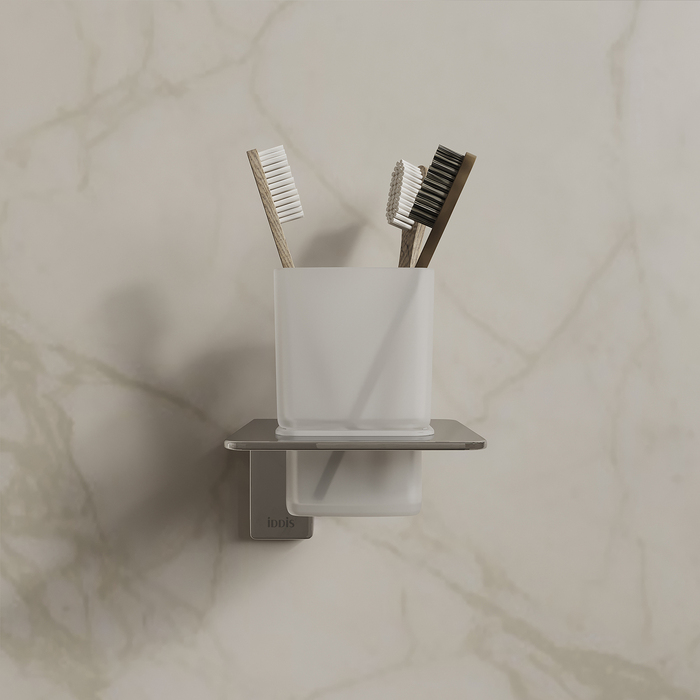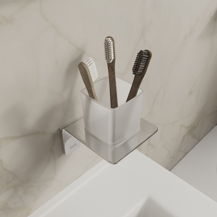 Подстаканник Slide из матового белого стекла в хромированном держателе благодаря прямым линиям и функциональному дизайну подойдет для интерьера любой современной ванной.