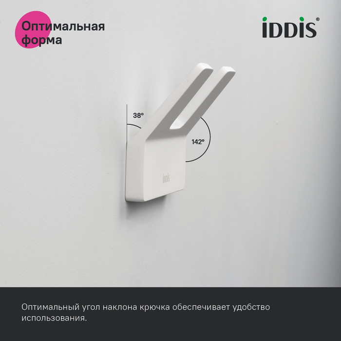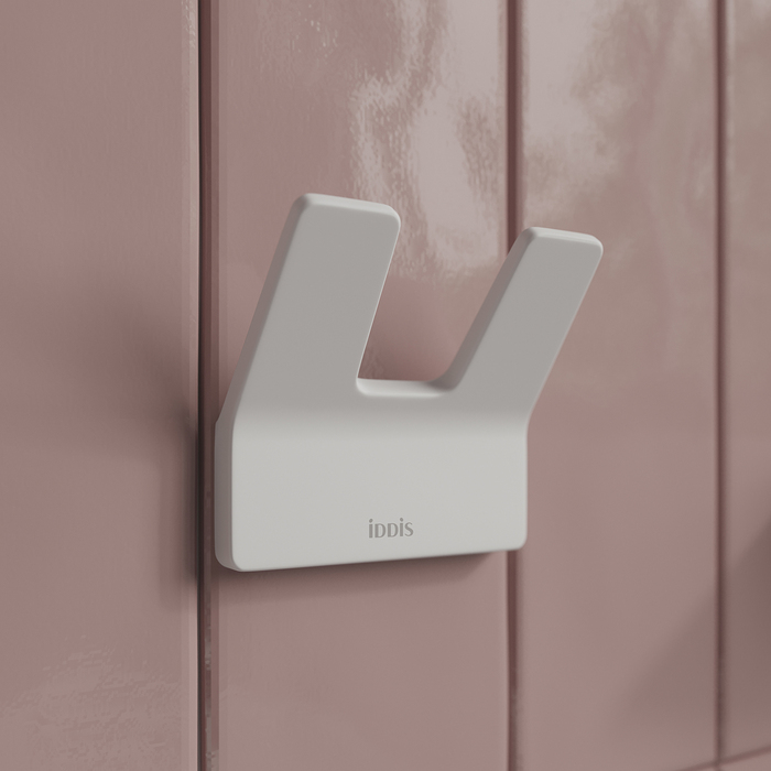 Двойной крючок Slide белого матового цвета имеет оптимальный угол и позволит надежно разместить сразу два полотенца или халата – и они не спадут. Благодаря прямым линиям и функциональному дизайну подойдет для интерьера любой современной ванной.
