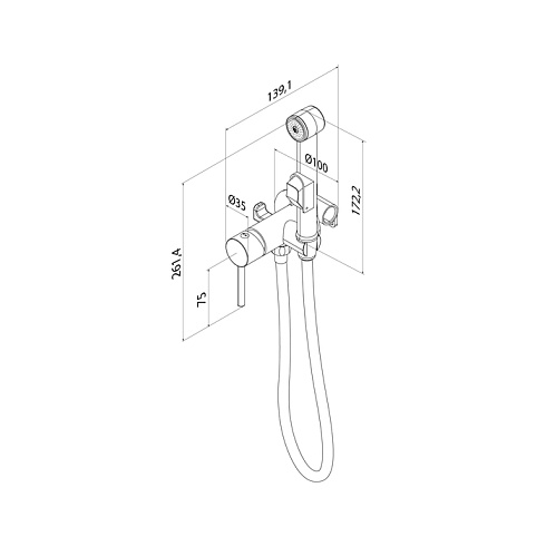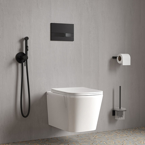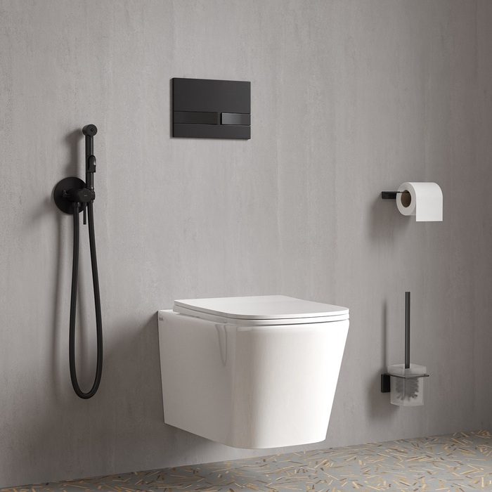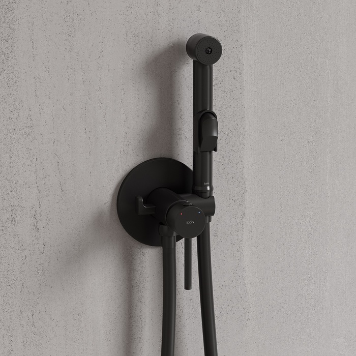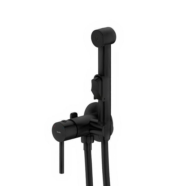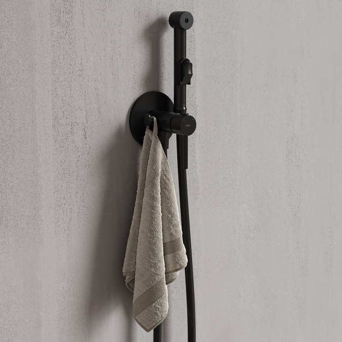 Встраиваемый смеситель с гигиеническим душем в стильном матовом черном цвете станет отличным дополнением современной ванной комнаты, привнесет в нее комфорт и эстетику. Имеет крючок для полотенца. Крючок и держатель для лейки при необходимости можно поменять местами. Гигиеническая лейка и душевой шланг длиной 1,2 метра в комплекте.