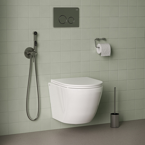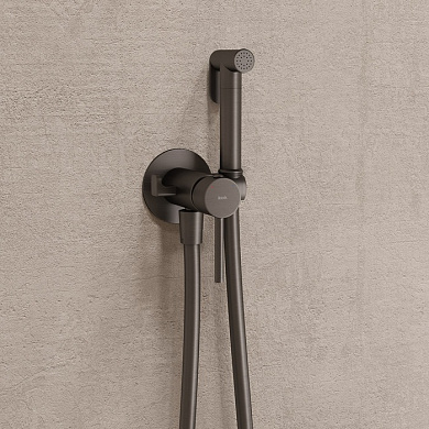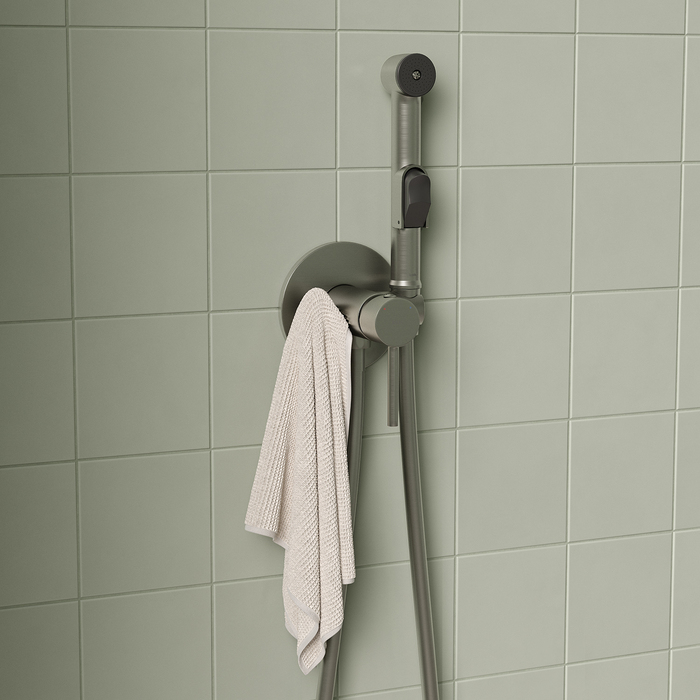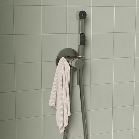 Встраиваемый смеситель с гигиеническим душем в стильном оттенке матового никеля подойдёт для современной туалетной комнаты, привнесет в неё комфорт и эстетику. Крючок на корпусе смесителя позволит разместить полотенце – оно будет всегда под рукой. Держатель для лейки и крючок для полотенца при необходимости можно поменять местами. Гигиеническая лейка и душевой шланг длиной 1,2 метра в комплекте.