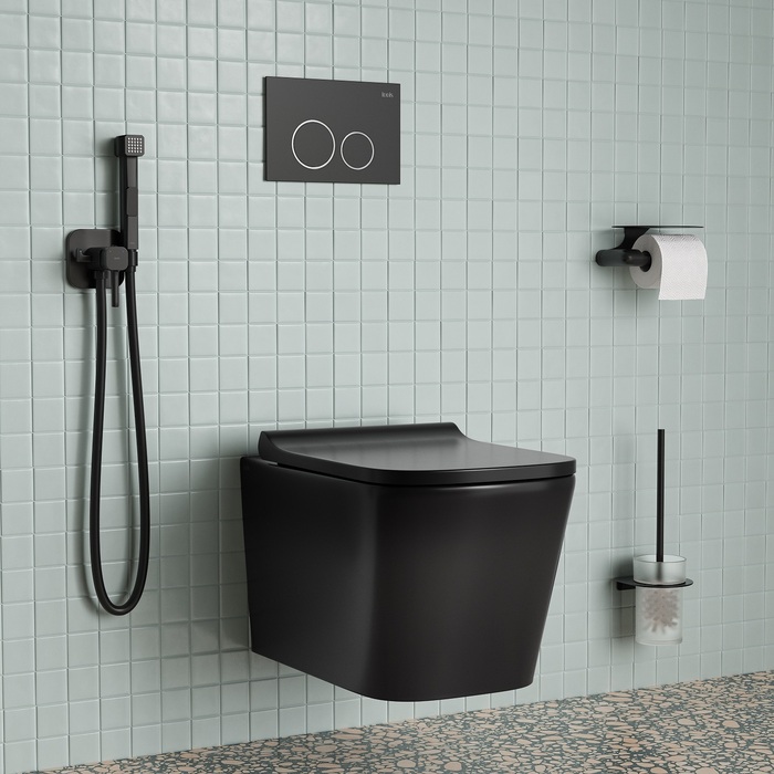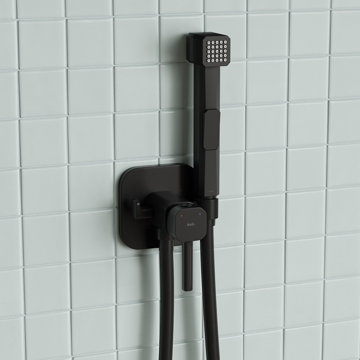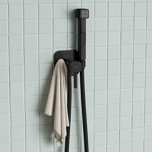 Встраиваемый смеситель с гигиеническим душем в стильном матовом черном цвете станет отличным дополнением современной ванной комнаты, привнесет в нее комфорт и эстетику. Имеет крючок для полотенца. Крючок и держатель для лейки при необходимости можно поменять местами. Гигиеническая лейка и душевой шланг длиной 1,2 метра в комплекте.