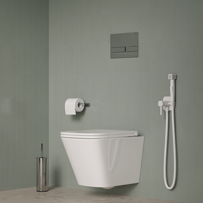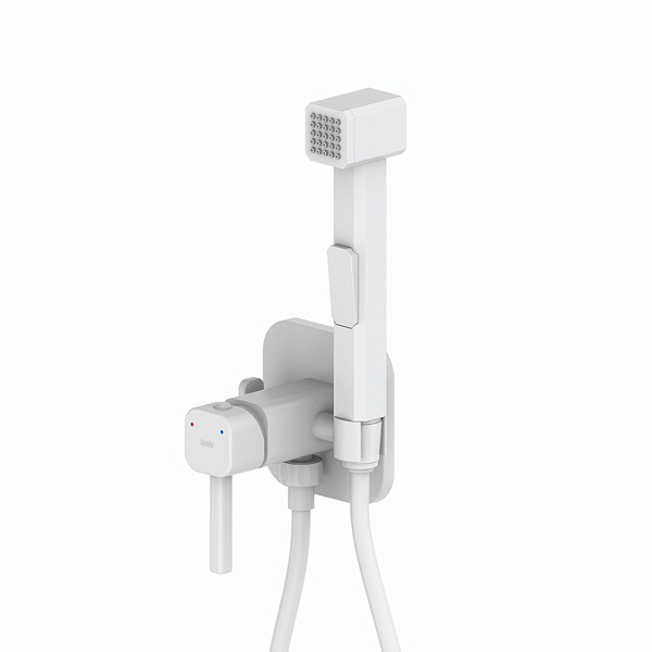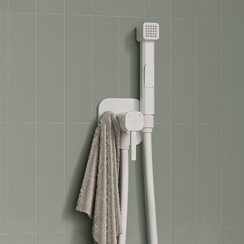 Встраиваемый смеситель с гигиеническим душем со стильным белым матовым покрытием подойдет для современной туалетной комнаты, привнесет в нее комфорт и эстетику. Крючок на корпусе смесителя позволит разместить полотенце – оно будет всегда под рукой. Держатель для лейки и крючок для полотенца при необходимости можно поменять местами. Гигиеническая лейка и душевой шланг длиной 1,2 метра в комплекте.