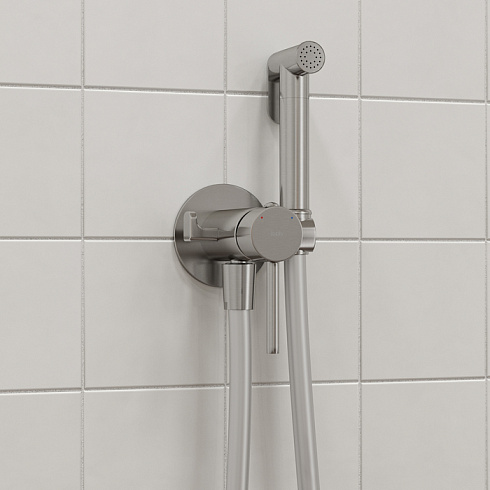 Встраиваемый смеситель с гигиеническим душем Axes в стильном оттенке матового хрома – практичный и стильный, его дизайн сочетает в себе трендовый минимализм форм и четкие грани. Имеет крючок для полотенца, который можно установить как слева, так и справа. Гладкий душевой шланг 1,2 м в комплекте.