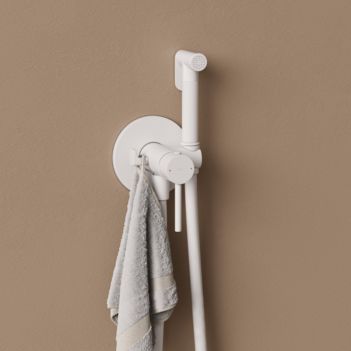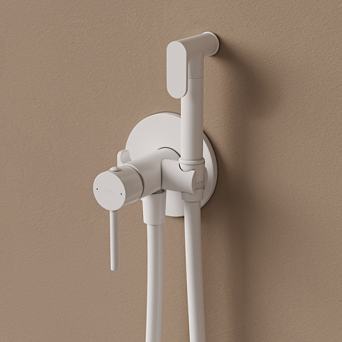 Встраиваемый смеситель с гигиеническим душем Axes в стильном матовом белом цвете – практичный и стильный, его дизайн сочетает в себе трендовый минимализм форм и округлые формы. Имеет крючок для полотенца, который можно установить как слева, так и справа, меняя местами с держателем для лейки. Душевой шланг с защитой от перекручивания в комплекте (длина 1,2 м).