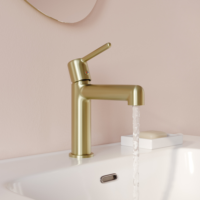 Стильный смеситель для умывальника, где удачно сочетает актуальный современный дизайн и новый трендовый оттенок матового золота с брашированным покрытием. Тонкая удлиненная ручка добавляет смесителю изящества и комфорт в управлении. Расстояние между ручкой и изливом увеличено для большего удобства.