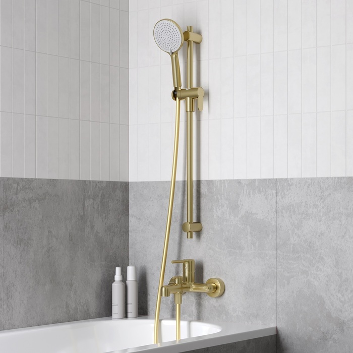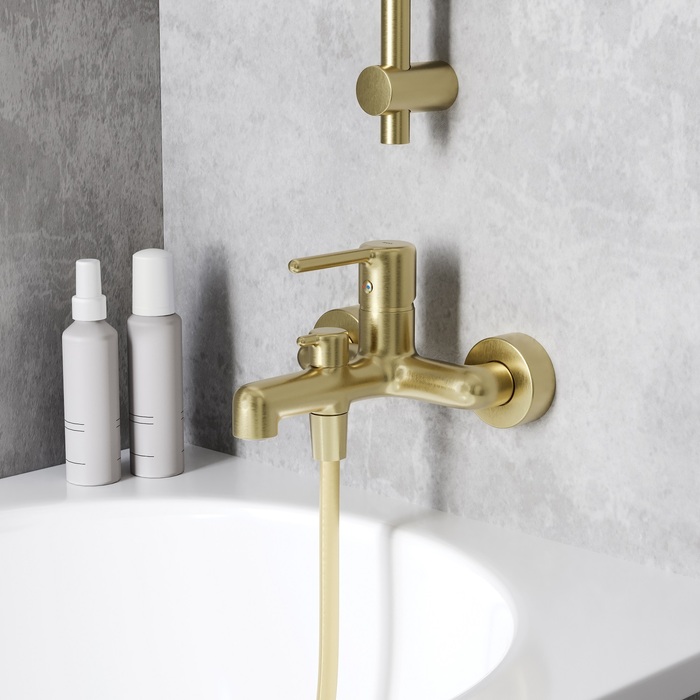 Стильный смеситель для ванны сочетает актуальный современный дизайн и новый трендовый оттенок матового золота с брашированным покрытием. Тонкая удлиненная ручка добавляет изящества и комфорт в управлении. Расстояние между ручкой и изливом увеличено для большего удобства. Без душевых аксессуаров в комплекте.