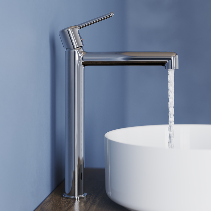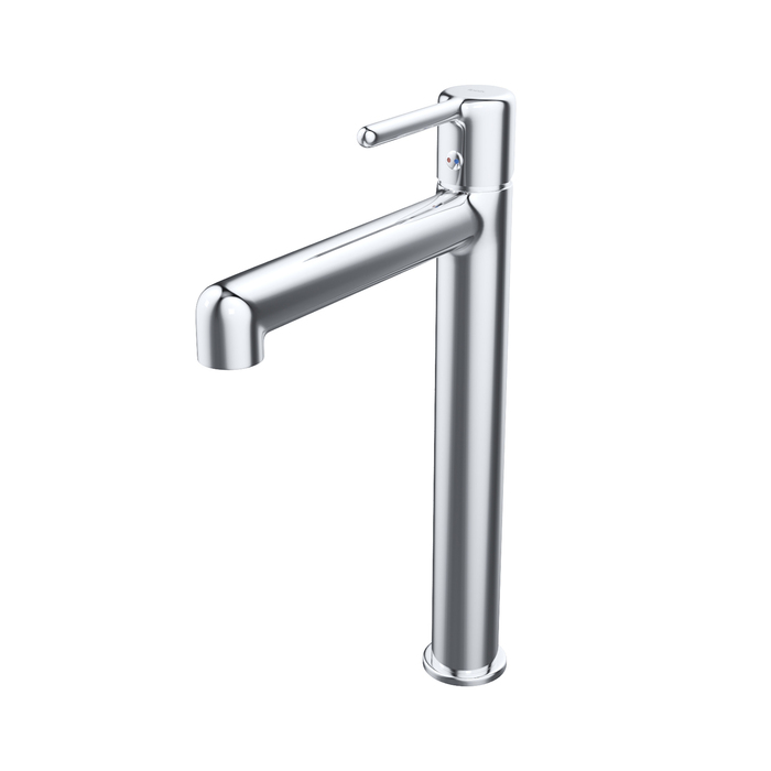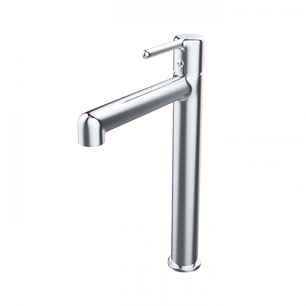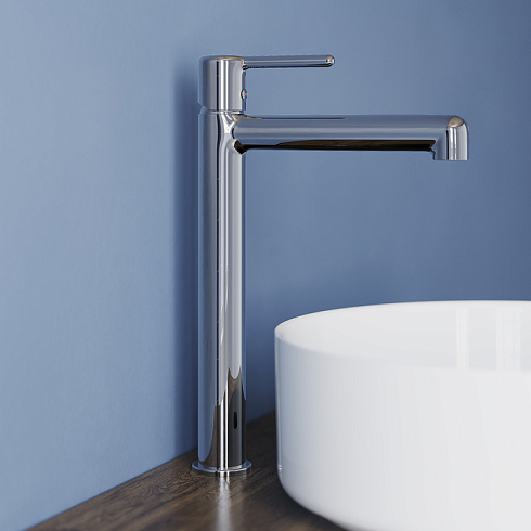 Стильный высокий смеситель для настольного умывальника удачно сочетает актуальный современный дизайн и классический цвет хрома. Тонкая удлиненная ручка добавляет смесителю изящества и комфорт в управлении. Расстояние между ручкой и изливом увеличено для большего удобства.
