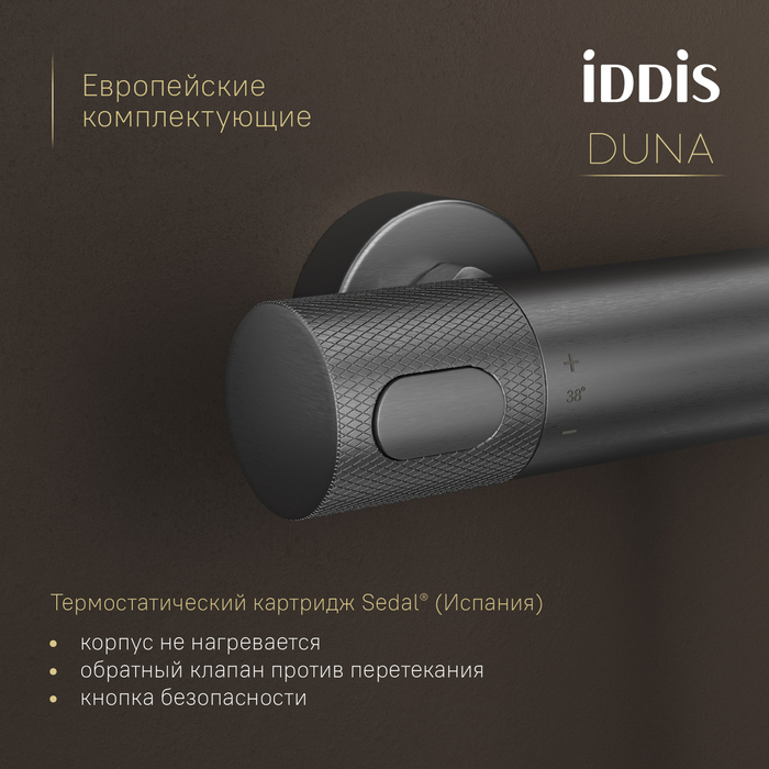 Без риска ожогов: термостатический картридж Sedal® (Испания) обеспечивает стабильную температуру, комфорт и безопасность. Подключён напрямую к горячей воде — корпус смесителя не нагревается.