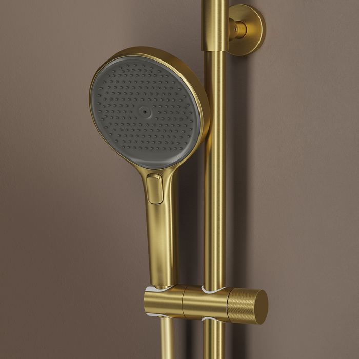 Душевая система с термостатом, тропическим и ручным душем и изливом Duna – воплощение актуальных трендов в дизайне смесителей в безупречном исполнении: фрезеровка, модные цвета и фактуры.