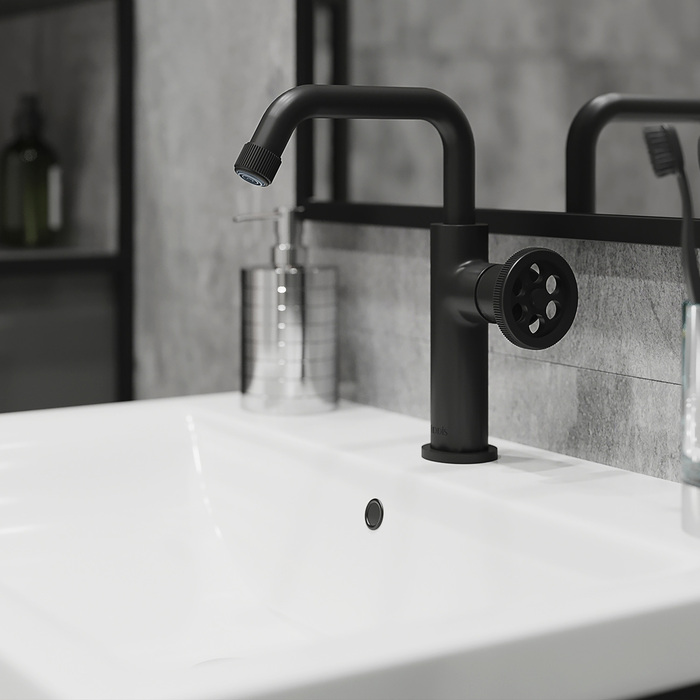 Смеситель для умывальника Grange в стильном матовом черном цвете имеет запоминающийся дизайн и яркие, неординарные детали. Круглая дизайнерская ручка красиво, оригинально выглядит и удобно поворачивается даже мыльной рукой. Такой смеситель прекрасно дополнит интерьер в трендовом стиле лофт.