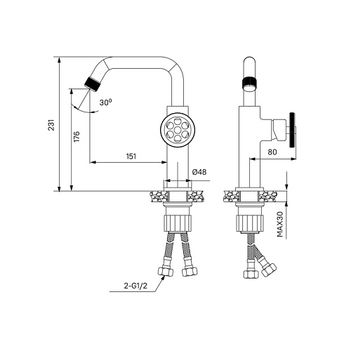 • Подключение к системе водоснабжения Гибкая подводка из нетоксичной EPDM резины в оплетке из нержавеющей стали, М10 - 1/2, длина 400 мм
