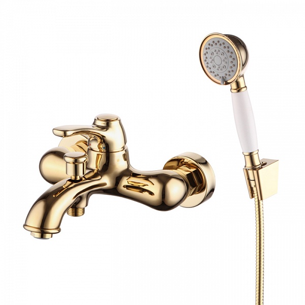 Смеситель для ванны Oldie – превосходное сочетание утонченной формы и современного функционала в ретро стилистике. Со смесителями из коллекции Oldie легко воплотить в жизнь любые дизайнерские идеи – оригинальные детали белого цвета и благородный золотой цвет корпуса легко сочетаются с любыми фактурными поверхностями и интерьерными решениями. Продуманные пропорции, наклон излива и положение аэратора позволяют с комфортом размещать руки под смесителем, что делает его удобным для всей семьи. В комплекте душевые аксессуары в тон смесителю — лейка с держателем и гибкий шланг для душа (1,5 м) в оплетке из нержавеющей стали с защитой от перекручивания.