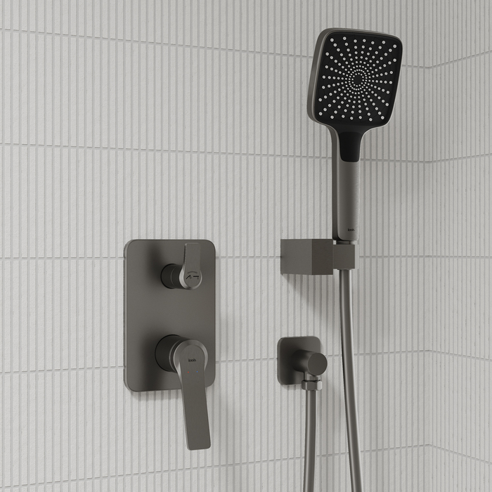 Внешние элементы душевой системы Parker в трендовом матовом графите с верхним тропическим душем и ручной лейкой. Предназначены для комплектации встраиваемого смесителя на два выхода UniCore.