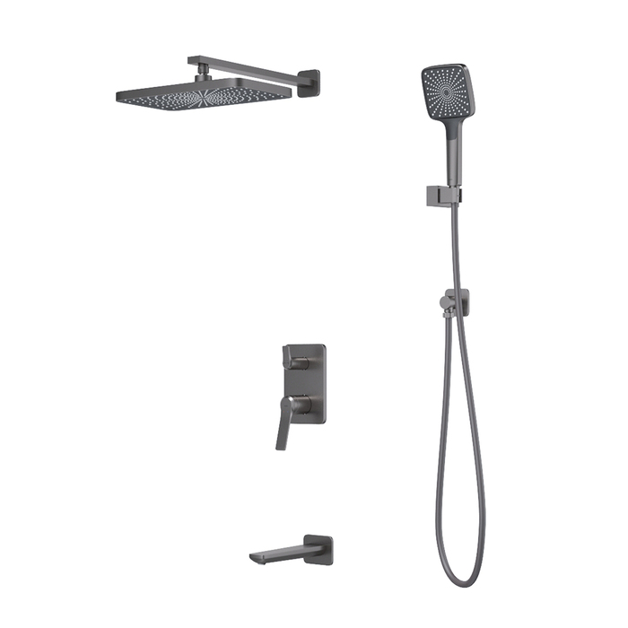 Внешние элементы душевой системы Parker в трендовом матовом графите с верхним тропическим душем, ручной лейкой и изливом. Предназначены для комплектации встраиваемого смесителя на три выхода UniCore.