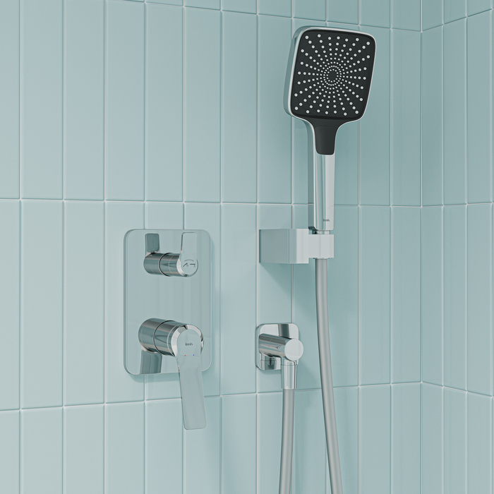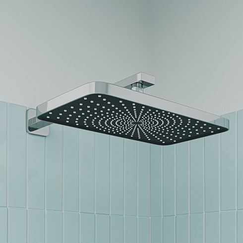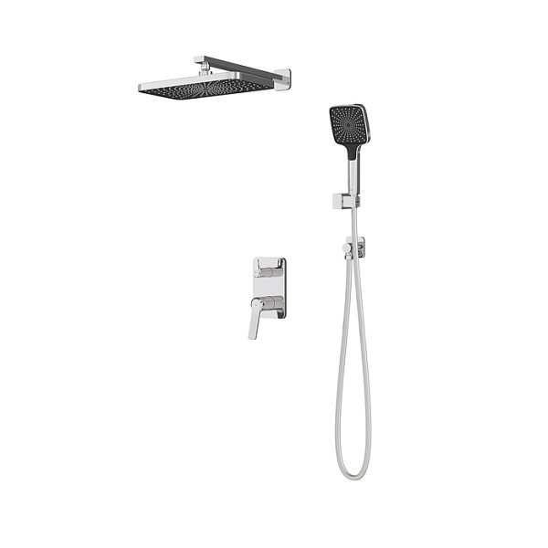 Внешние элементы душевой системы Parker в универсальном глянцевом хроме с верхним тропическим душем и ручной лейкой. Предназначены для комплектации встраиваемого смесителя на два выхода UniCore.