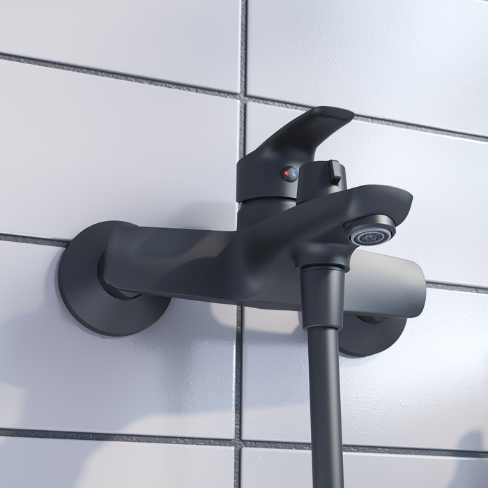 Смеситель для ванны Ray имеет универсальный дизайн и благодаря актуальному матовому черному цвету станет ярким акцентом современного интерьера ванной. В комплекте однорежимная лейка для душа, ПВХ-шланг и настенный держатель для лейки – все в тон смесителя.