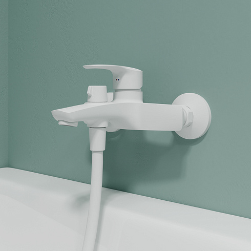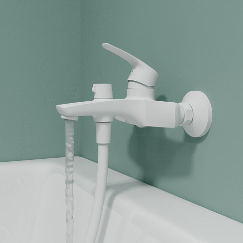Смеситель для ванны Ray имеет универсальный дизайн и благодаря трендовому матовому белому цвету станет ярким акцентом современного интерьера ванной.