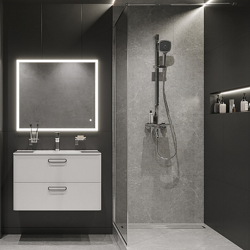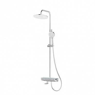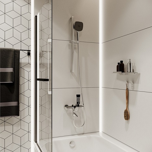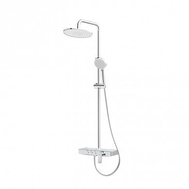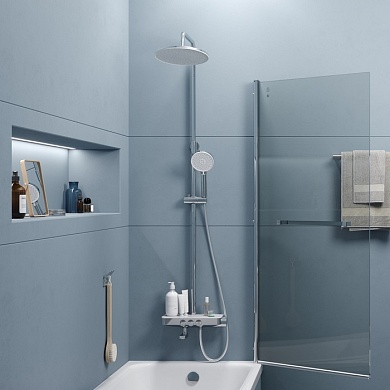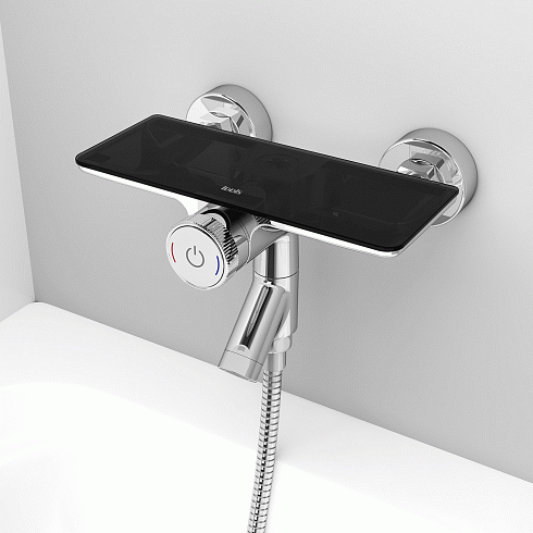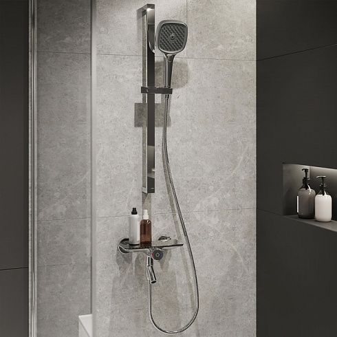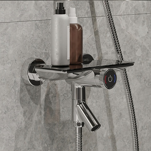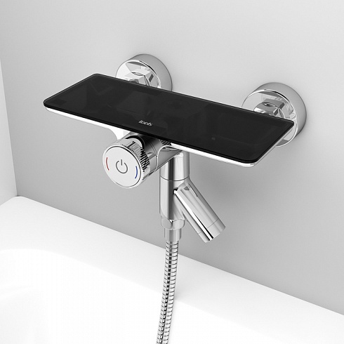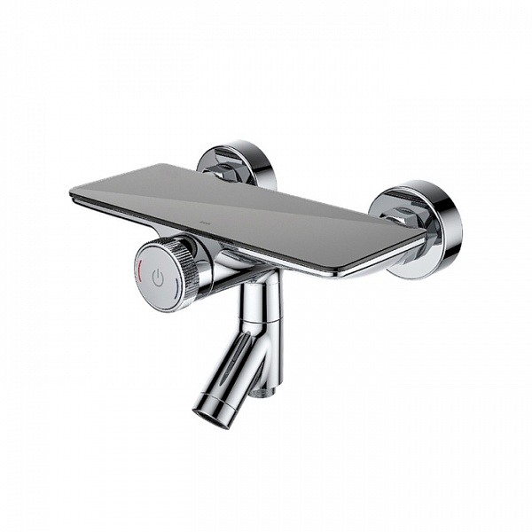 Смеситель для ванны Shefy – мечты о будущем, доступные уже сегодня. Модель в цвете хром обращает на себя внимание дизайнерским корпусом с декоративными элементами из закаленного стекла. Одновременно технологичное и невероятно простое управление Push Control позволяет кнопками осуществлять переключение режимов с излива на верхнюю или нижнюю лейку. Регулировка температуры воды до комфортной производится поворотом ручки, оптимальный напор воды – определяется при установке. Любимые косметические средства будет удобно разместить на небольшой полочке на корпусе смесителя.