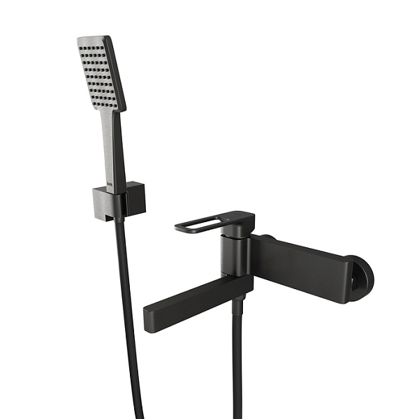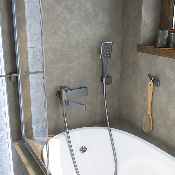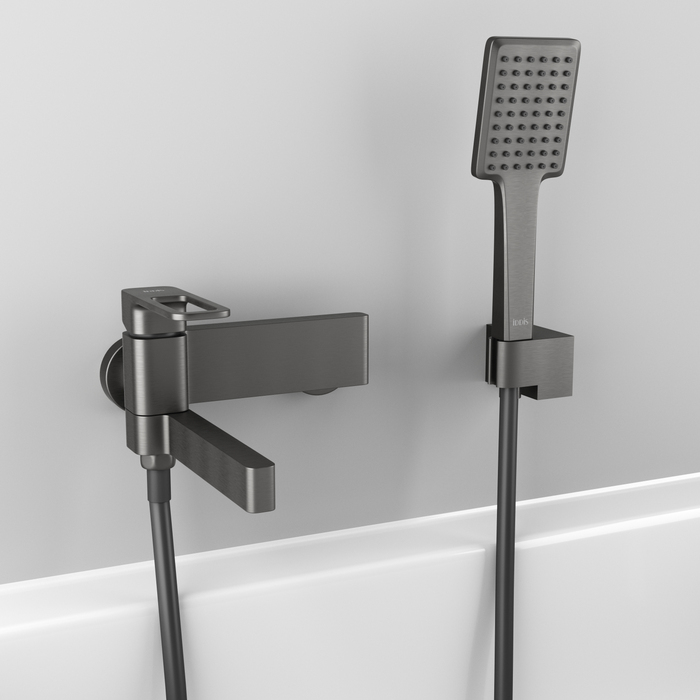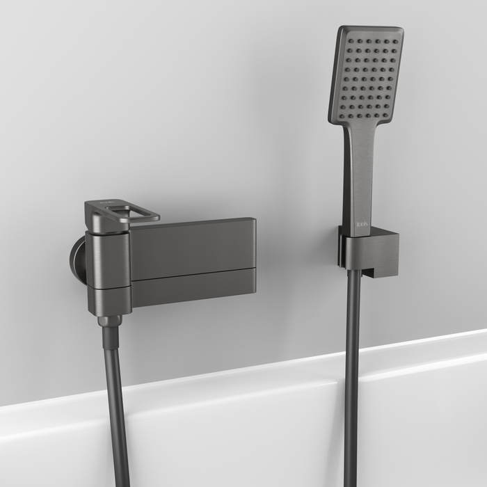 Смеситель для ванны Slide в стильном оттенке графит со складным изливом — стильное функциональное решение без лишних деталей, подойдет и для ванны, и для душевой кабины. Отверстие-петля на ручке выполняет декоративную и при этом практичную роль — ее легко захватить даже намыленной рукой и отрегулировать напор или температуру. В комплекте душевые аксессуары в тон смесителю — прямоугольной лейкой, гладким шлангом из ПВХ длиной 1,5 метра с защитой от перекручивания и держателем для лейки.