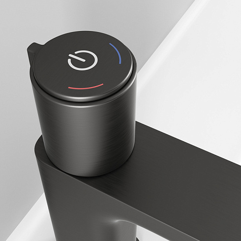 Включение-выключение воды осуществляется одним нажатием на кнопку, а температуру можно регулировать вращением ручки вокруг кнопки. При этом смеситель запоминает комфортную температуру воды: достаточно просто оставить ручку в выбранном положении — и больше не нужно настраивать воду при каждом включении смесителя.