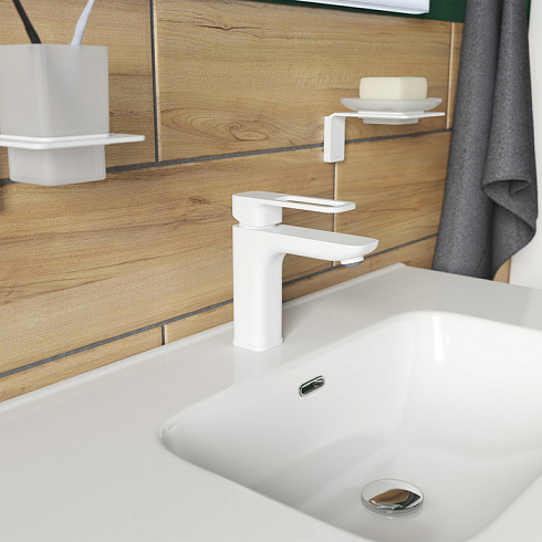 Смеситель для умывальника Slide благодаря стильному дизайну и трендовому матовому белому цвету станет ярким акцентом современного интерьера ванной. Отверстие-петля на ручке выполняет декоративную и при этом практичную роль — ее легко захватить даже намыленной рукой и отрегулировать напор или температуру. Аэратор поворотный, что позволяет менять наклон потока воды, что делает комфортным и мытье рук, и наполнение больших емкостей.