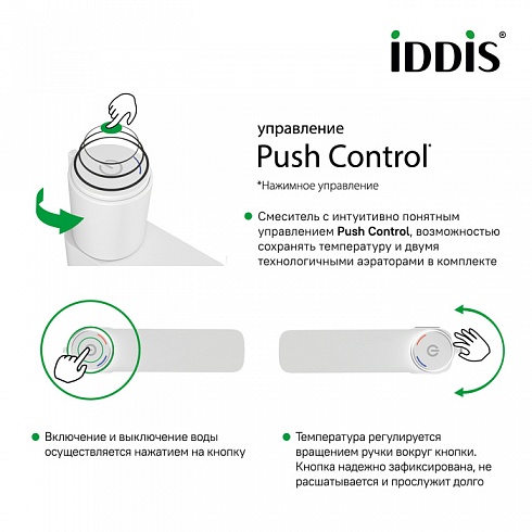 Смеситель для умывальника Slide с управлением Push Control в актуальном белом цвете — новый уровень удобства и стиля IDDIS®. Интуитивно понятное кнопочное управление Push Control — точная и невероятно простая настройка комфортной температуры воды.