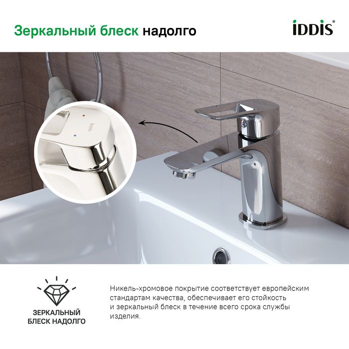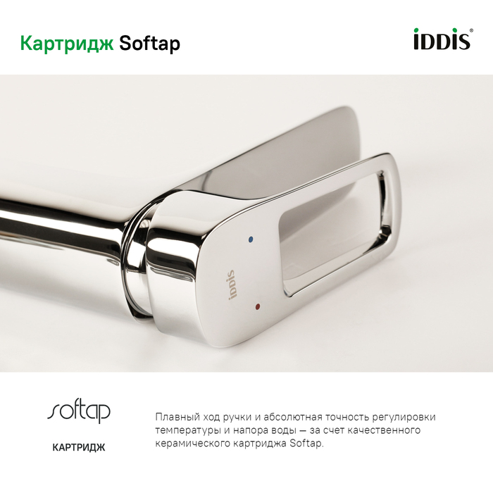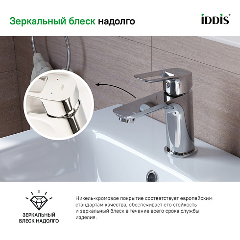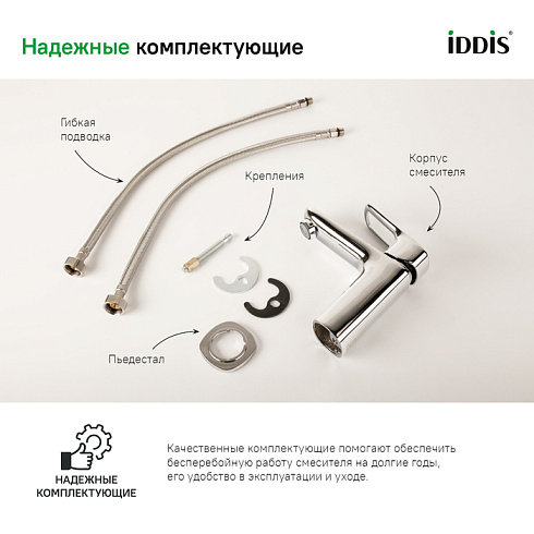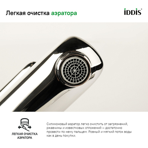 • Смеситель IDDIS® прослужит долго благодаря надежному корпусу из прочной латуни, стойкому к коррозии, резким изменениям давления и перепадам температуры воды.