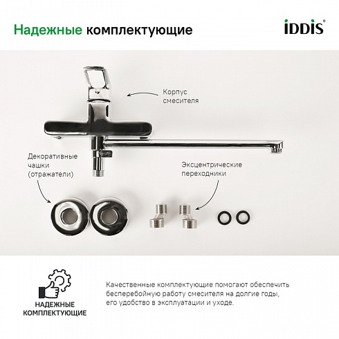 • Смеситель IDDIS® прослужит долго благодаря надежному корпусу из прочной латуни, стойкому к коррозии, резким изменениям давления и перепадам температуры воды.