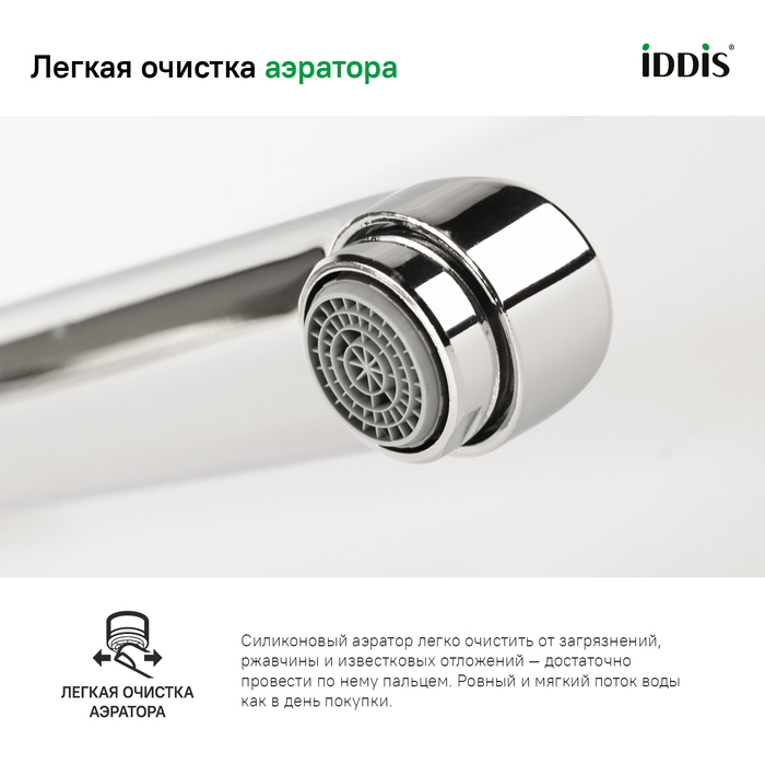 • Аэратор из прочного эластичного силикона создает ровный и мягкий поток воды без брызг и легко очищается от загрязнений, ржавчины и известковых отложений — достаточно провести по нему пальцем.
