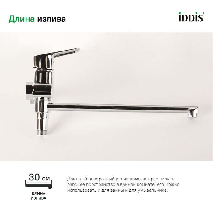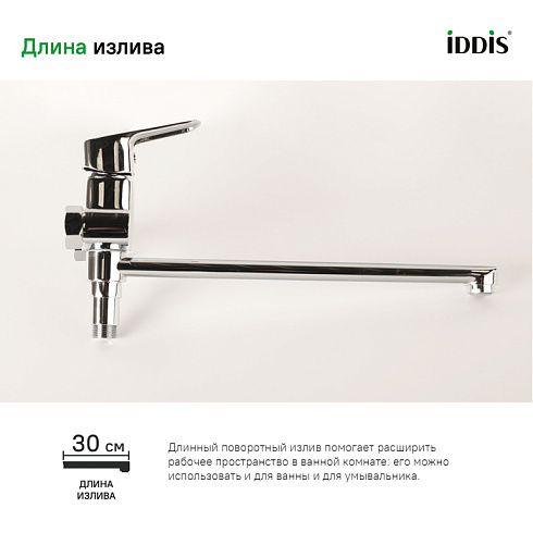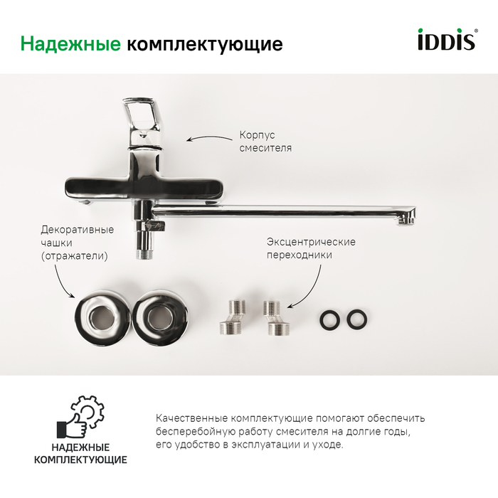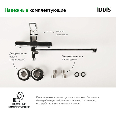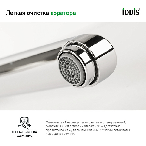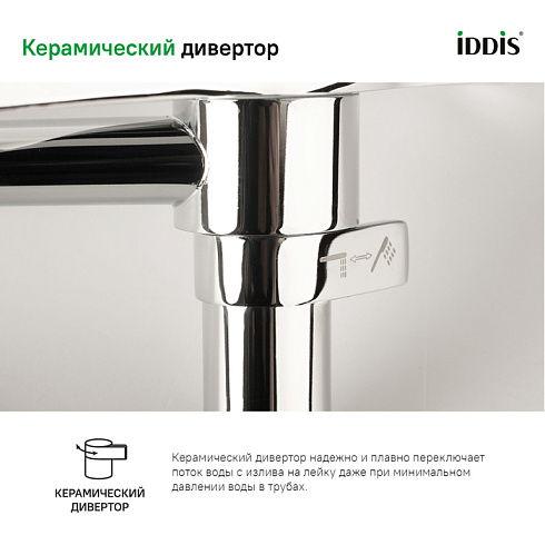 • Смеситель IDDIS® прослужит долго благодаря надежному корпусу из прочной латуни, стойкому к коррозии, резким изменениям давления и перепадам температуры воды.