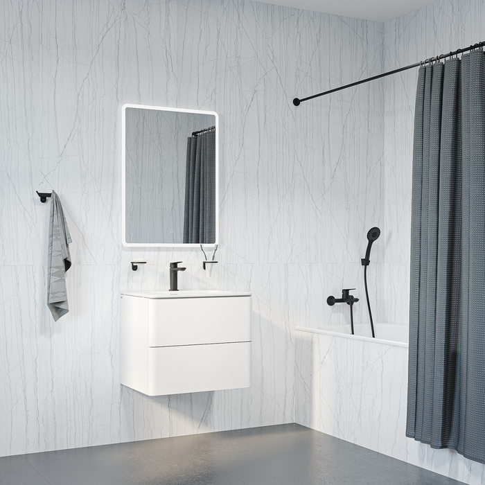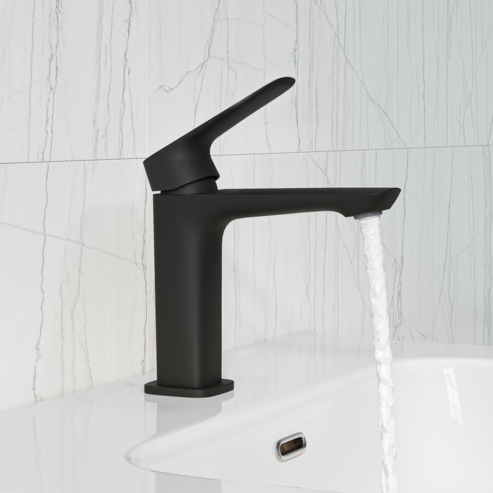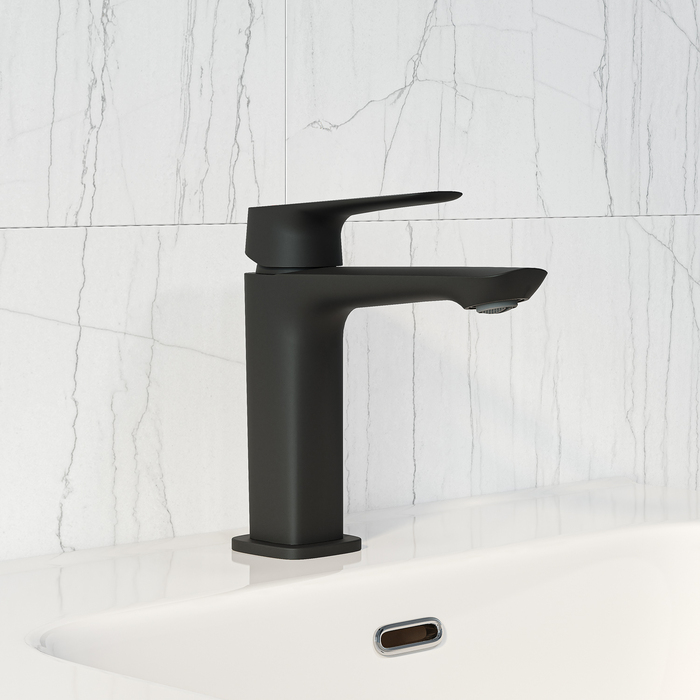 Смеситель для умывальника Token универсального дизайна в стильном матовом черном цвете с плавной геометрией линий подойдет к интерьеру и в классическом, и в современном стиле. В комплекте гибкая подводка и крепеж.