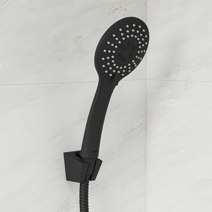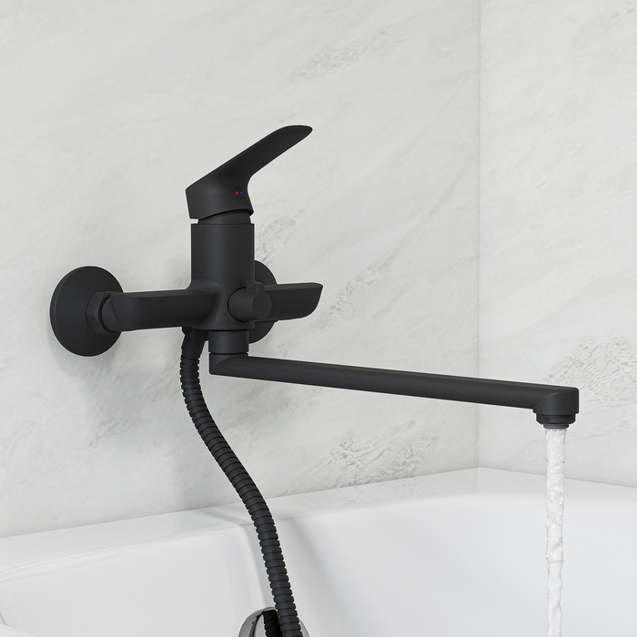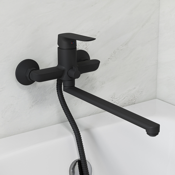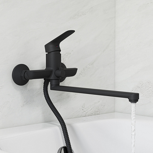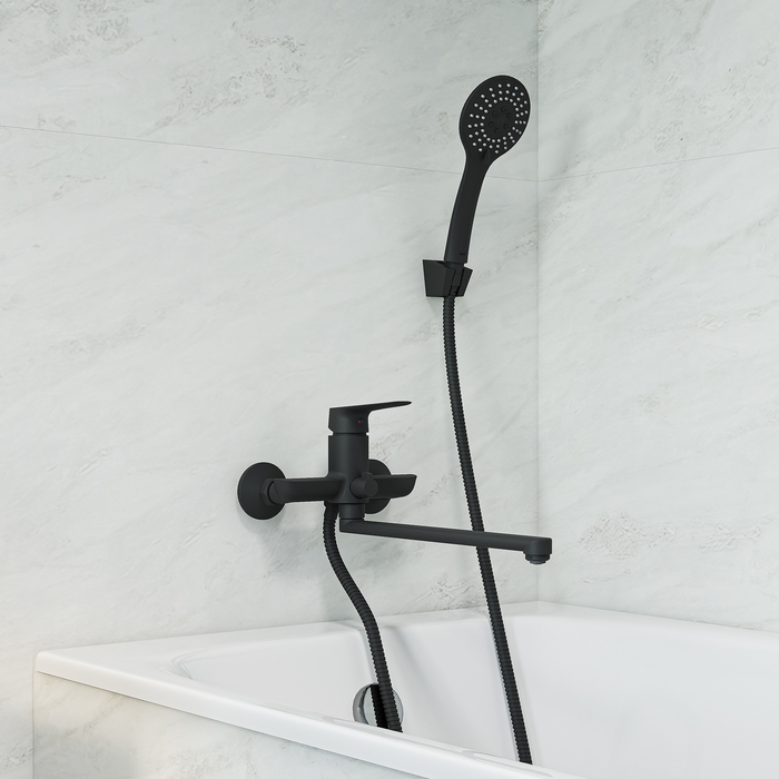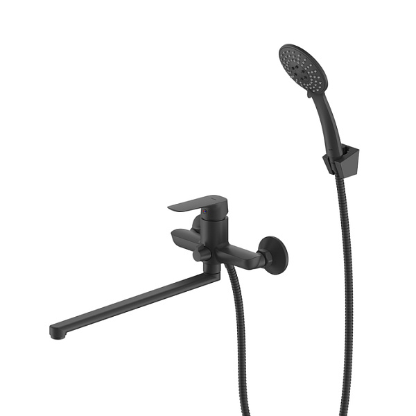 Смеситель для ванны с длинным изливом Token универсального дизайна в стильном матовом черном цвете с плавной геометрией линий подойдет к интерьеру и в классическом, и в современном стиле. Душевые аксессуары (ручная лейка для душа с 3 режимами, шланг длиной 1,5 м и держатель) в комплекте.