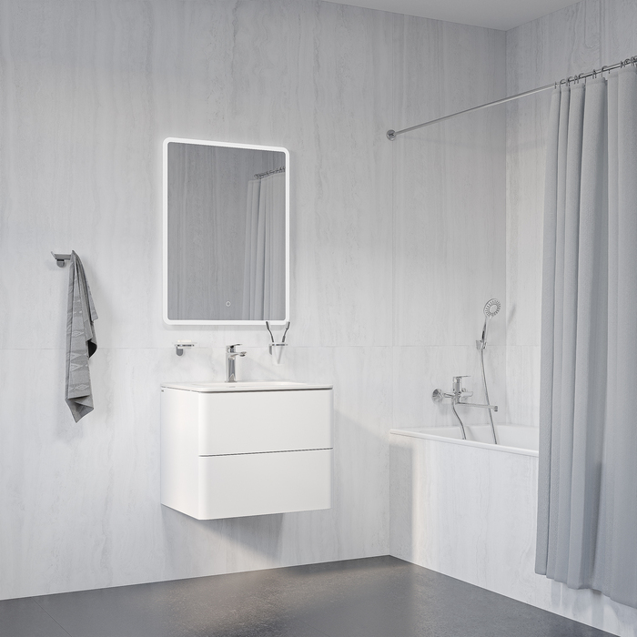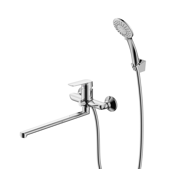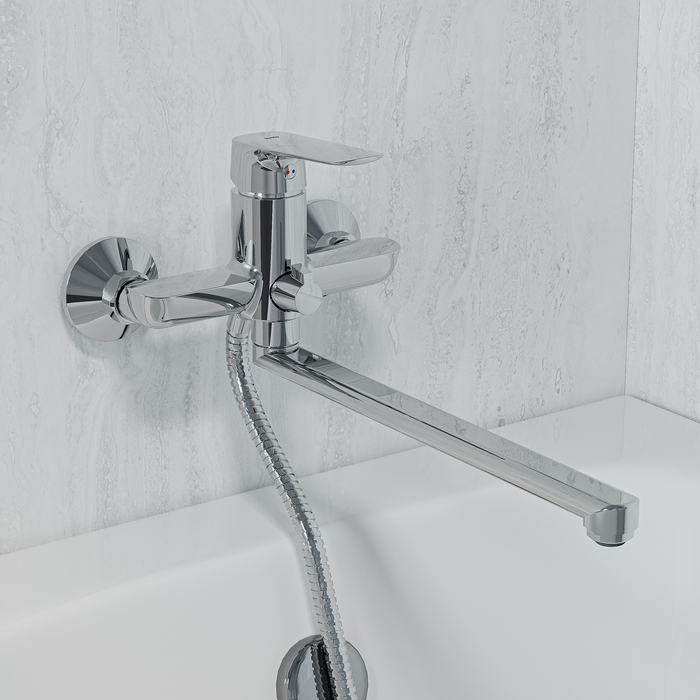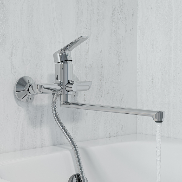 Смеситель для ванны с длинным изливом Token универсального дизайна с плавной геометрией линий подойдет к интерьеру и в классическом, и в современном стиле. Душевые аксессуары (ручная лейка для душа с 3 режимами, шланг длиной 1,5 м и держатель) в комплекте.