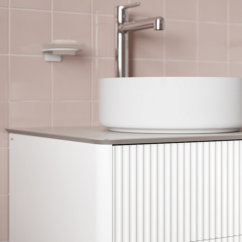 • Влагостойкая матовая столешница из тонкого сверхпрочного керамогранита стильного цвета «светло-серый бетон» повторяет радиус скругления угла тумбы. Край филигранно запилен под 45 градусов и отполирован до глянцевого блеска – выглядит эстетично и при этом безопасен. Простая в монтаже – с готовыми отверстиями под смеситель и раковину.