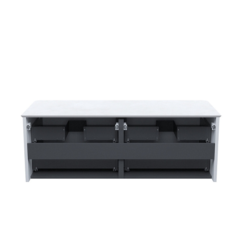 • Влагостойкая матовая столешница из тонкого сверхпрочного керамогранита стильного цвета «светло-серый бетон» повторяет радиус скругления угла тумбы. Край филигранно запилен под 45 градусов и отполирован до глянцевого блеска – выглядит эстетично и при этом безопасен. Без отверстий – можно самостоятельно выбрать расположение раковины и смесителя (одного или двух комплектов).