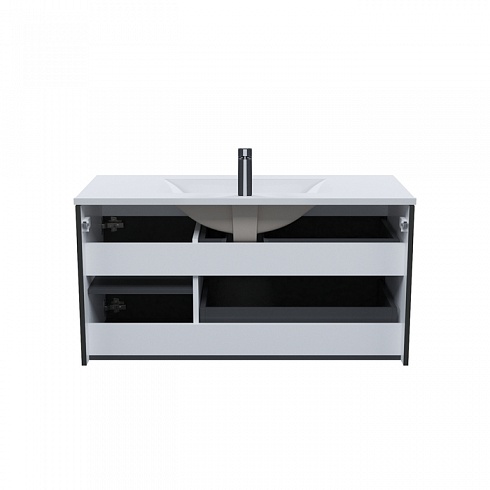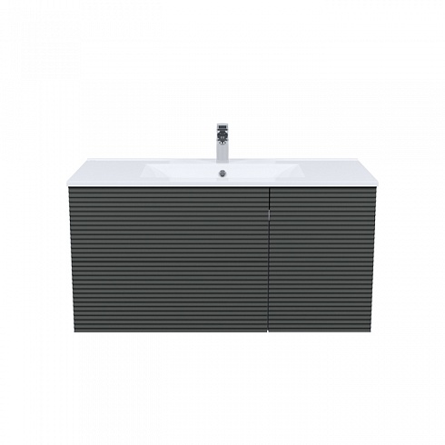 Вместительная подвесная тумба для ванной комнаты Bild с умывальником и выдвижными ящиками и полками – красивый дизайн с трендовой горизонтальной фрезеровкой в сочетании с популярным темно-серым цветом, удобством и практичностью.