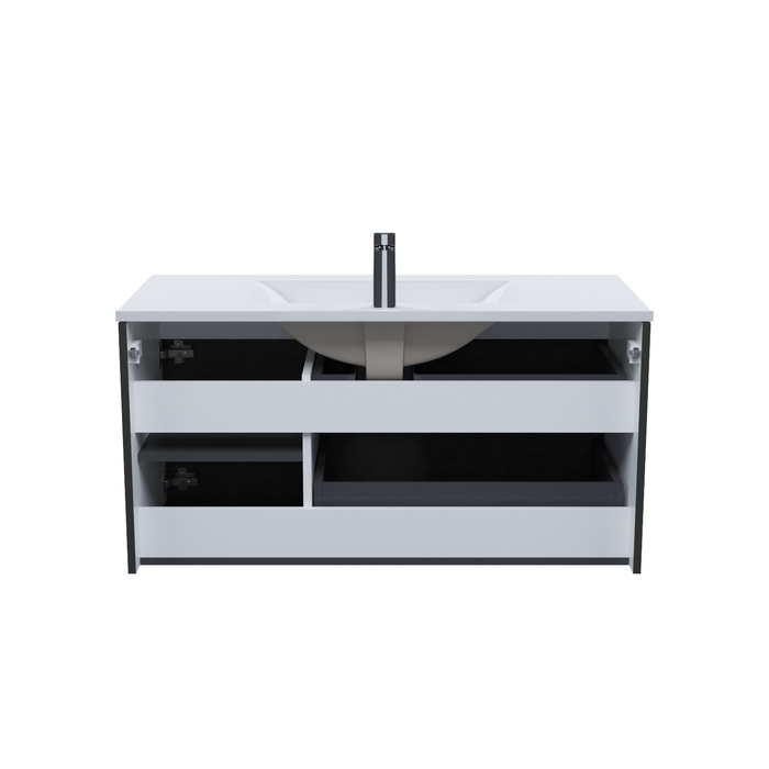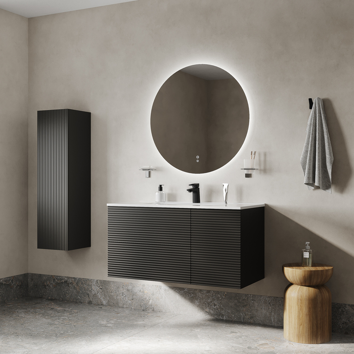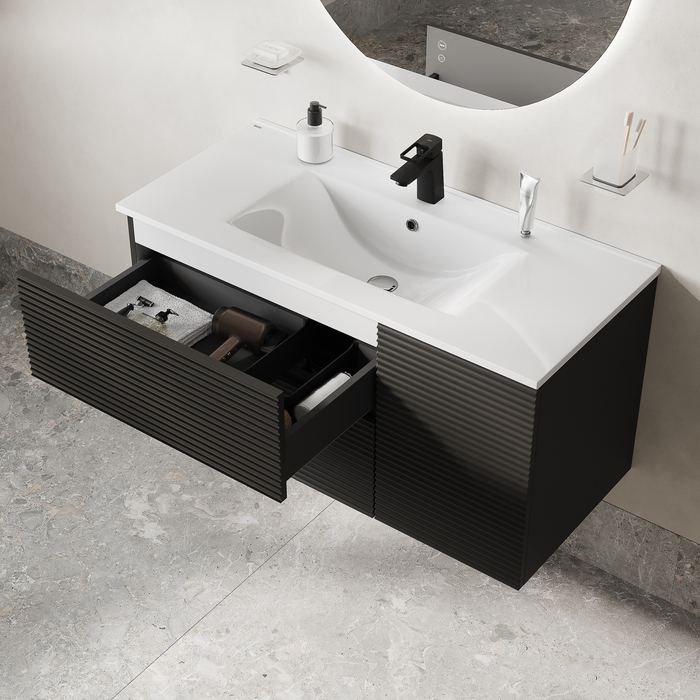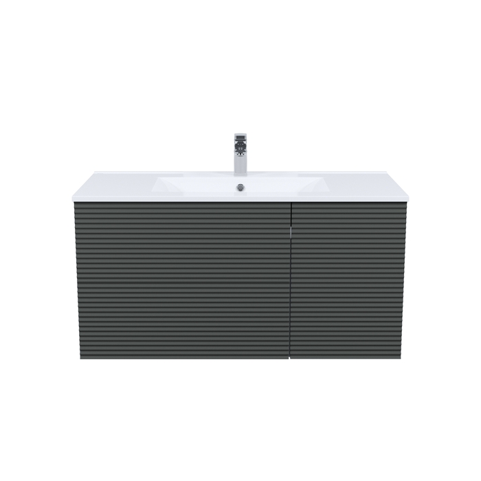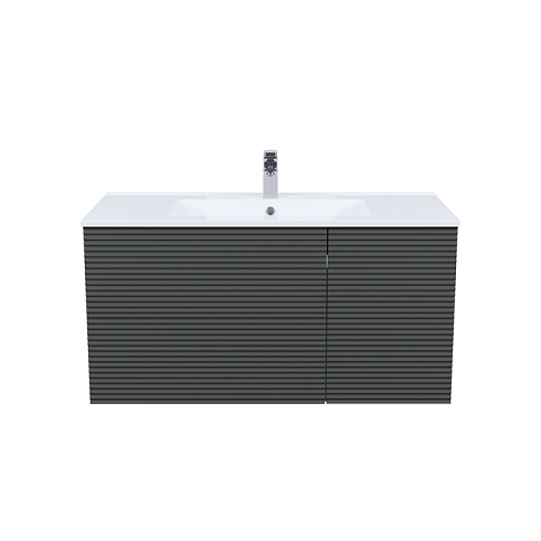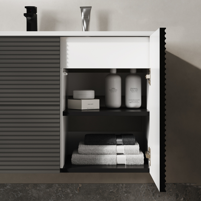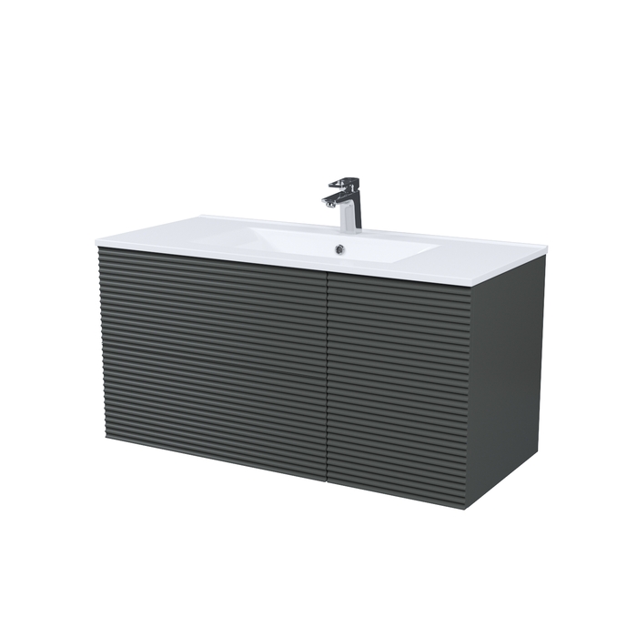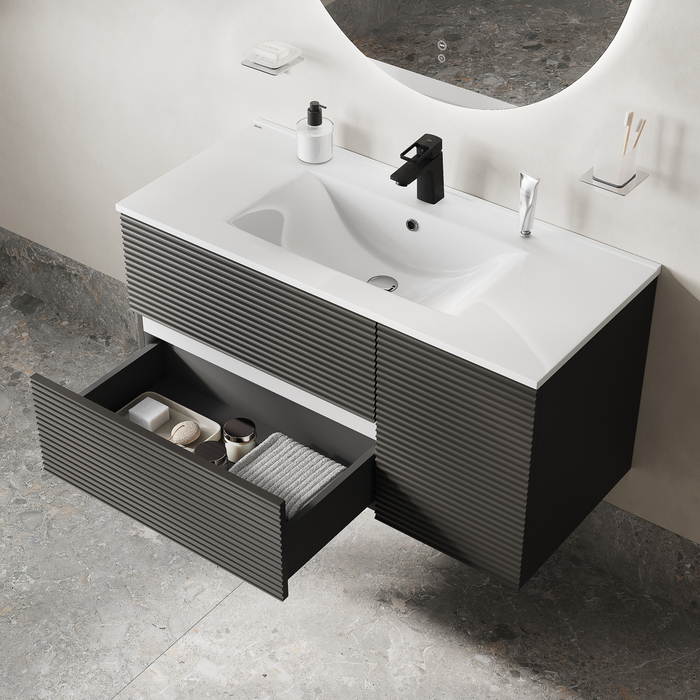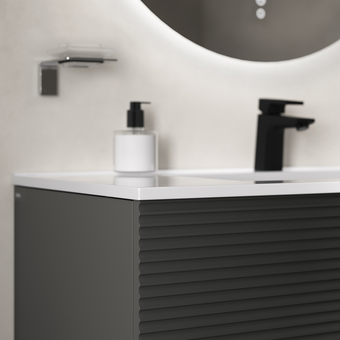 Вместительная подвесная тумба для ванной комнаты Bild с умывальником и выдвижными ящиками и полками – красивый дизайн с трендовой горизонтальной фрезеровкой в сочетании с популярным темно-серым цветом, удобством и практичностью.