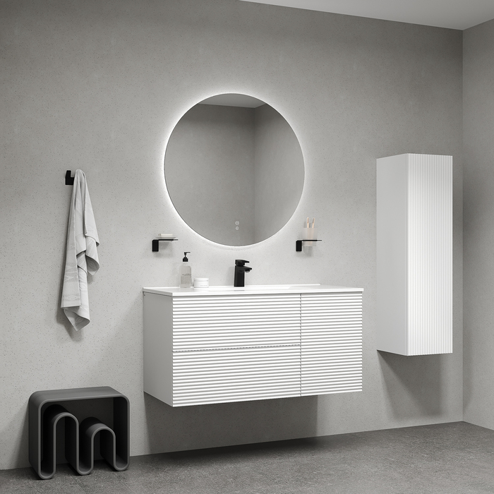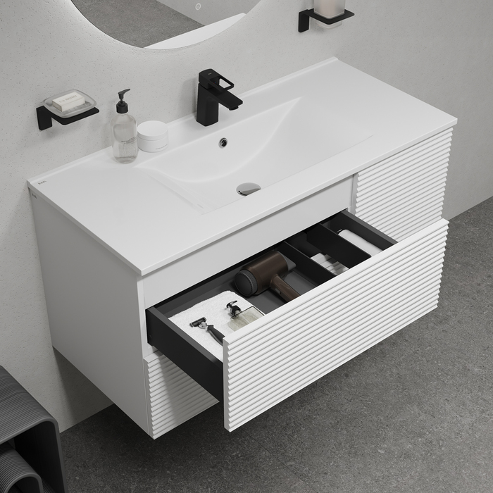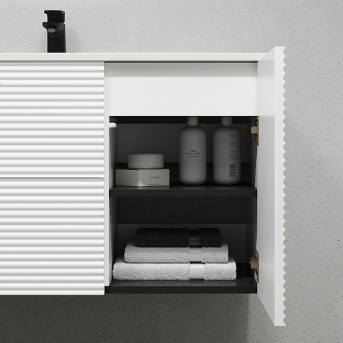 Вместительная подвесная тумба для ванной комнаты Bild с умывальником и выдвижными ящиками и полками – красивый дизайн с трендовой горизонтальной фрезеровкой в сочетании с универсальным белым цветом, удобством и практичностью.