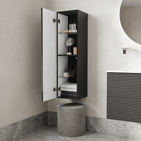 Подвесной пенал для ванной комнаты Bild – красивый дизайн с вертикальной фрезеровкой в сочетании с популярным темно-серым цветом, удобством и практичностью. Универсальная ориентация: пенал можно подвесить так, чтобы дверки открывались в удобную вам сторону (пенал можно перевернуть на 180 градусов, при этом перевешивать дверцы не нужно).