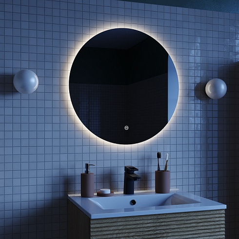 Стильное круглое зеркало Bild диаметром 60 см со встроенной LED-подсветкой. Не имеет рамы, за счёт чего смотрится воздушно и легко, и благодаря универсальному дизайну украсит интерьер любой ванной.