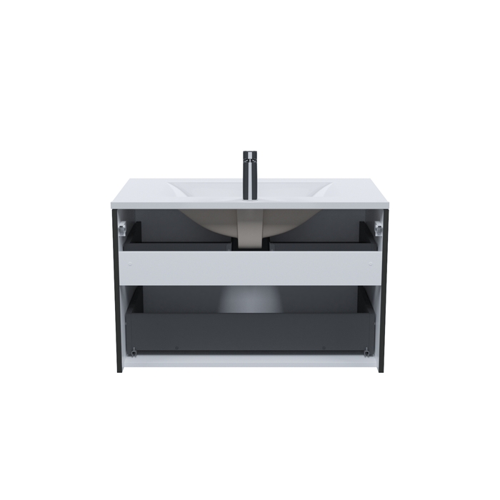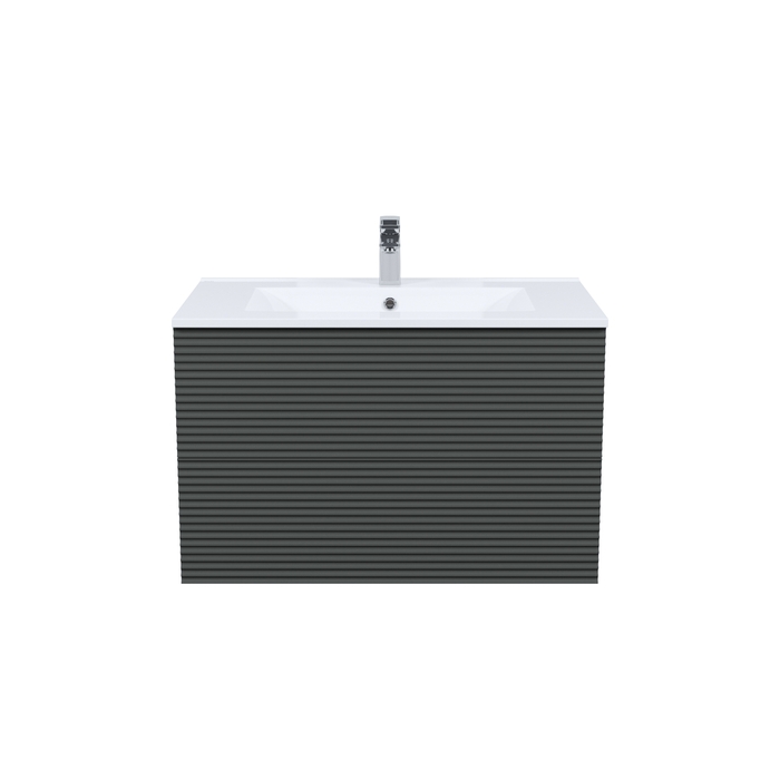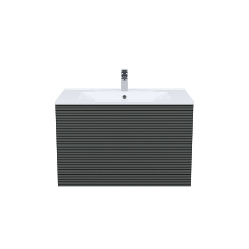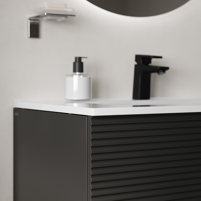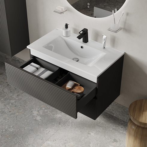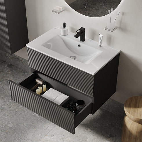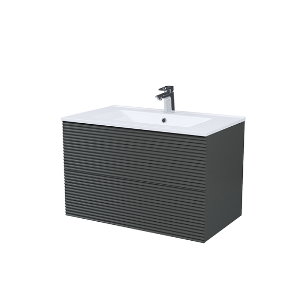 Вместительная подвесная тумба для ванной комнаты Bild с умывальником и выдвижными ящиками – красивый дизайн с трендовой горизонтальной фрезеровкой в сочетании с популярным темно-серым цветом, удобством и практичностью.