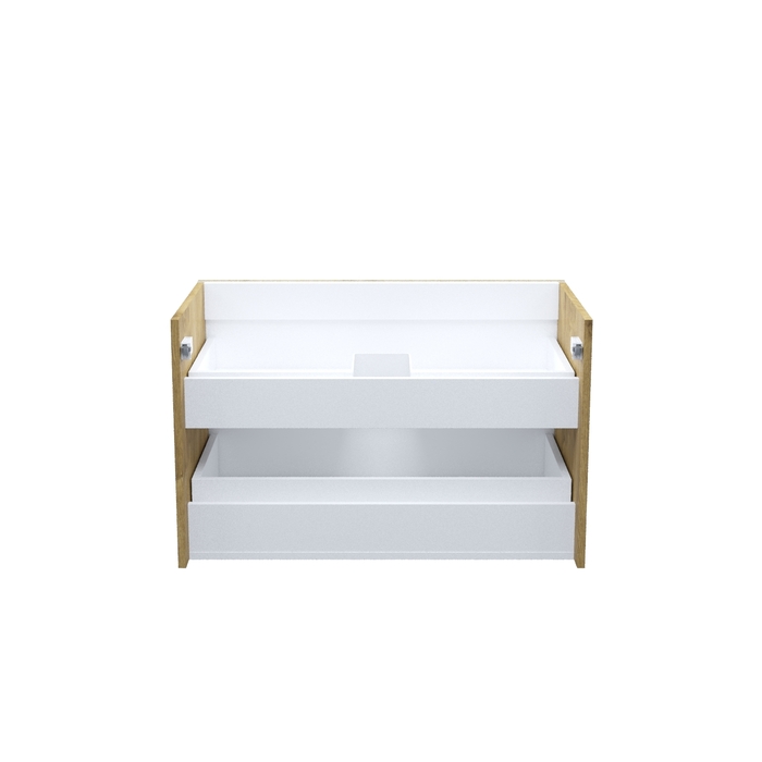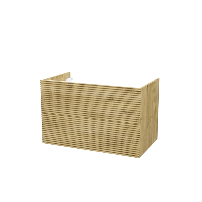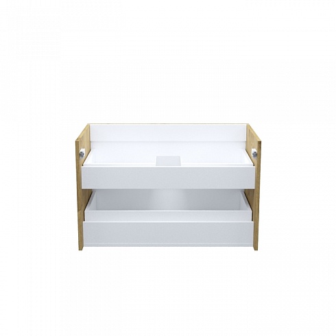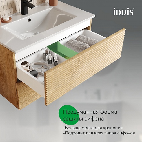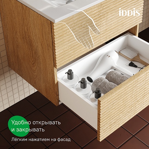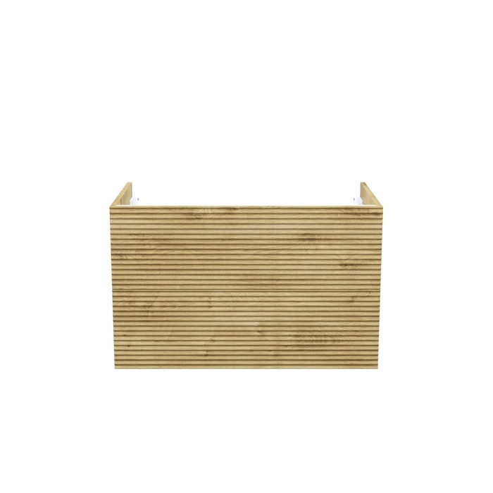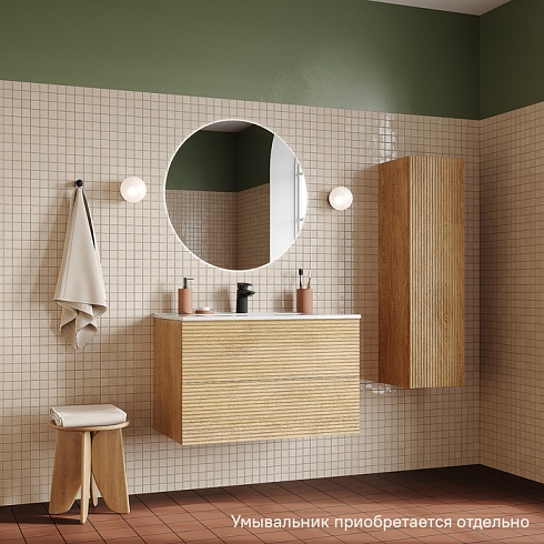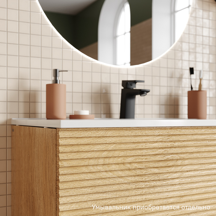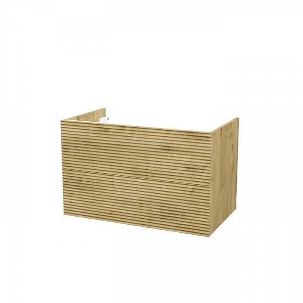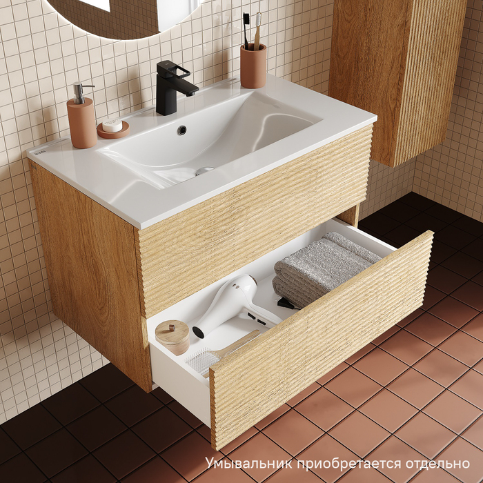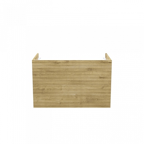 Компактная подвесная тумба для ванной комнаты Bild с ящиками – красивый дизайн со структурной горизонтальной фрезеровкой в сочетании с теплым оттенком дуба, удобством и практичностью. Умывальник приобретается отдельно (подходит умывальник IDDIS® арт. 0138000i28).