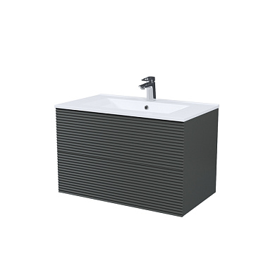 Вместительная подвесная тумба для ванной комнаты Bild с умывальником и ящиками – красивый дизайн со структурной горизонтальной фрезеровкой в сочетании с теплым оттенком дуба, удобством и практичностью.